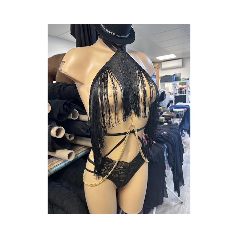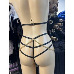 Cette pièce de lingerie audacieuse unit la délicatesse de la dentelle, la souplesse de la dentelle et la force symbolique des chaînes dorées.
